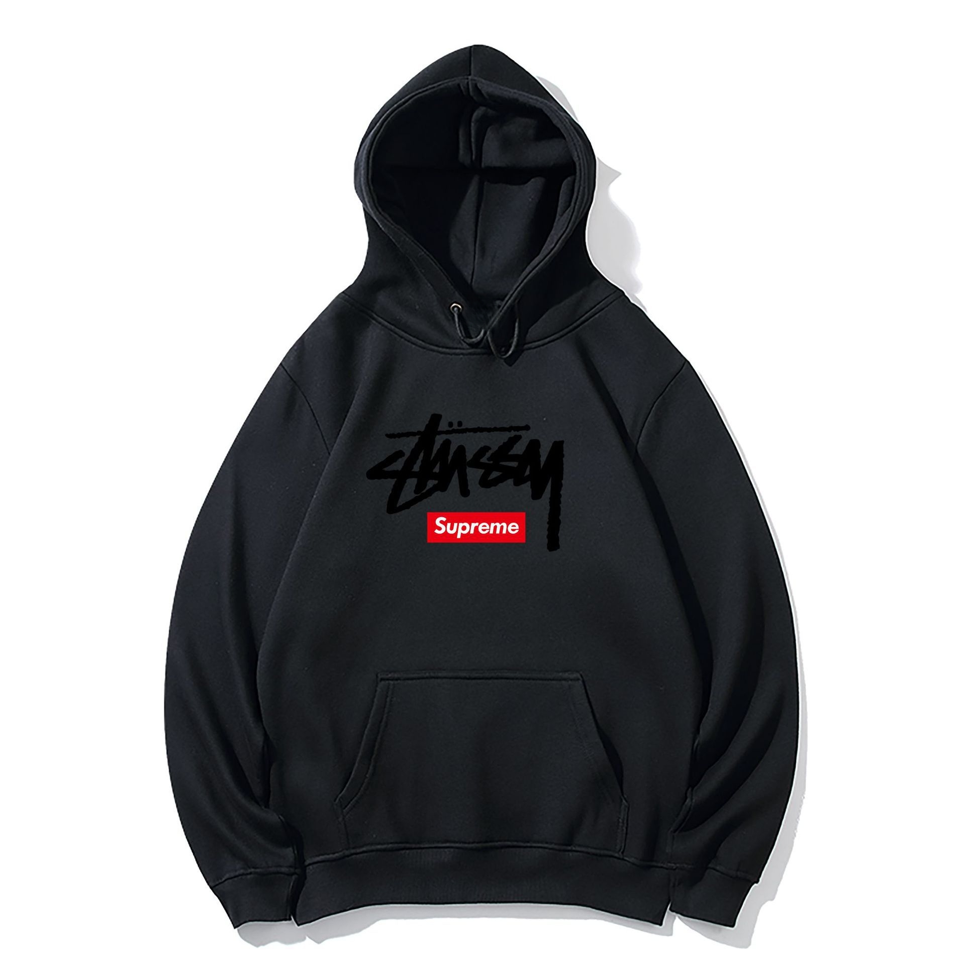 Supreme Casual fashion hoodie with kangaroo pockets, Stussy collaboration print, relaxed and comfortable fit.
