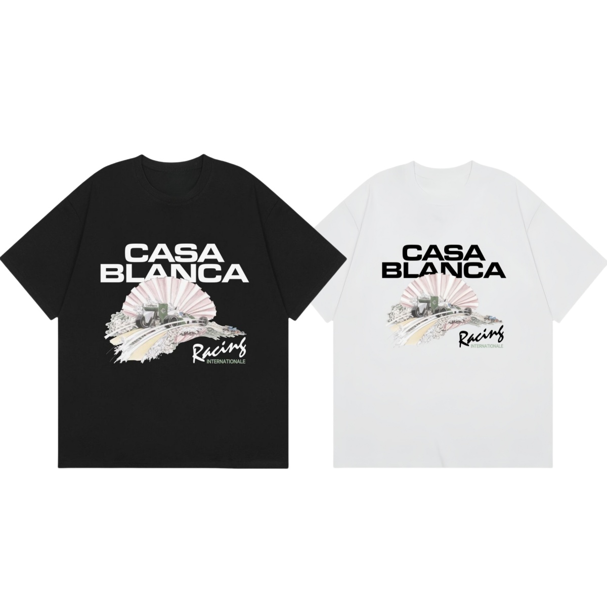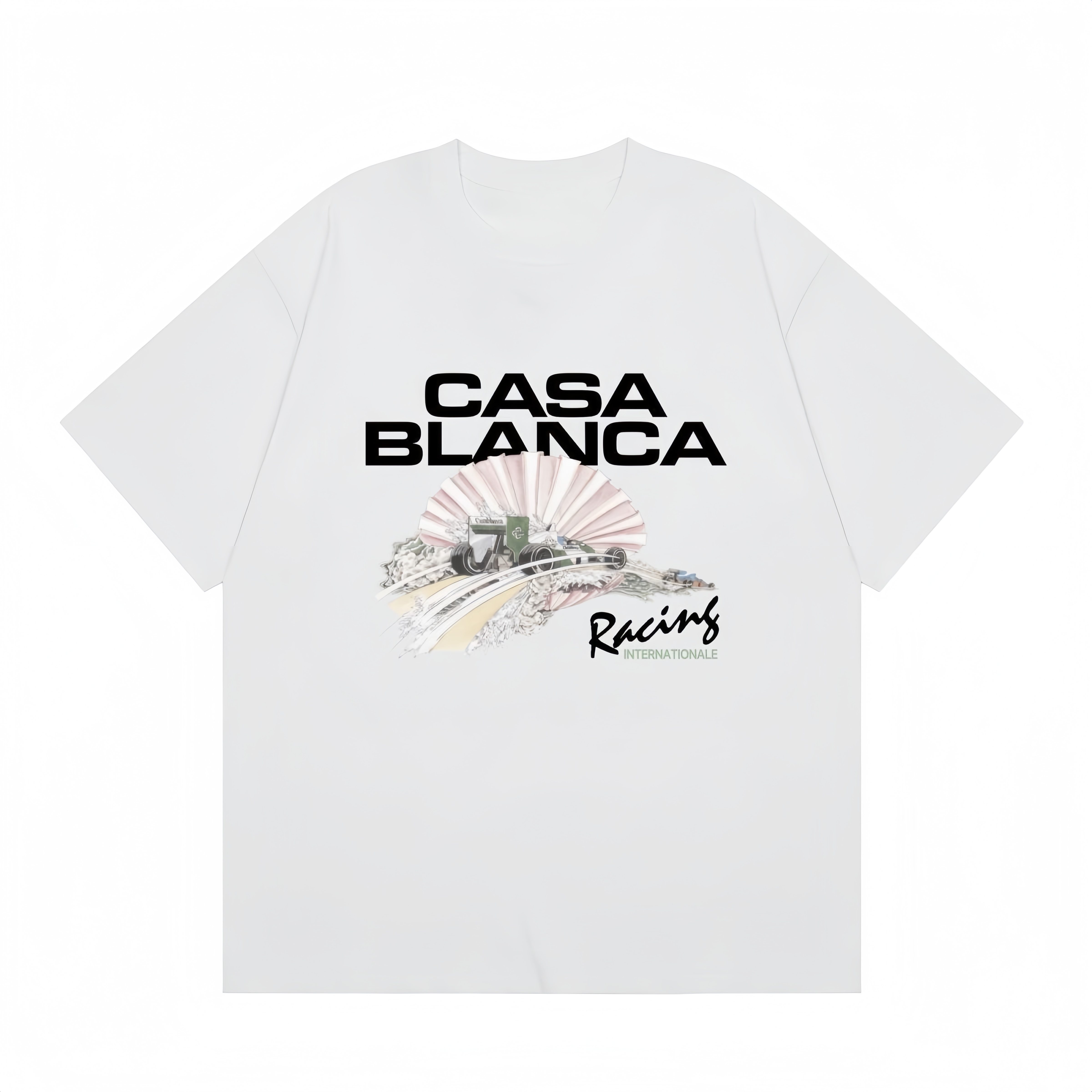 Casablanca Niche New Men's T-Shirt Racing-Inspired Letter Print Relaxed-Fit White Short-Sleeve Top