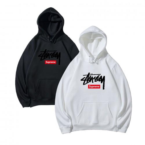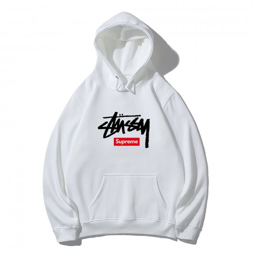 Supreme Casual fashion hoodie with kangaroo pockets, Stussy collaboration print, relaxed and comfortable fit.